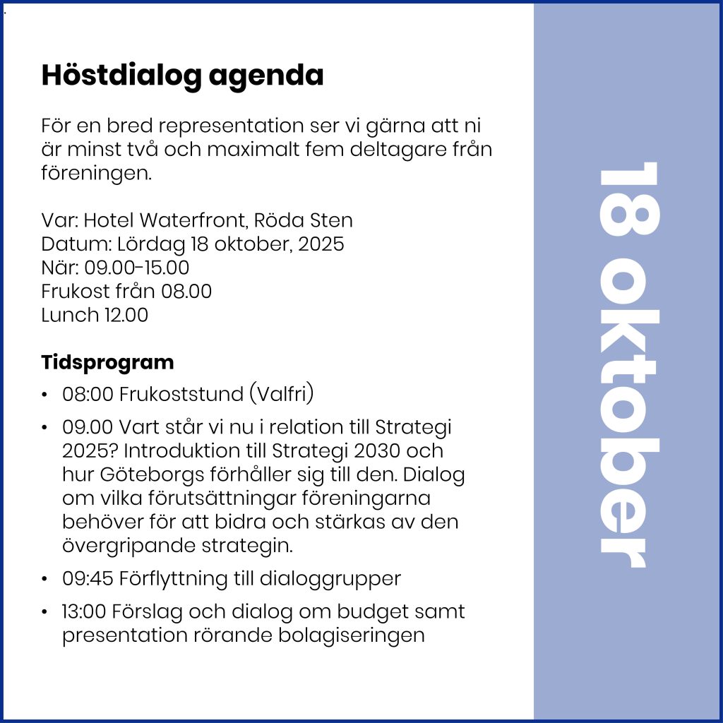 Höst- och vårdialog är avsedda för arenaföreningar, dess ordförande samt av föreningen utvalda nyckelpersoner. Vi rekommenderar att ni är minst 2 max 5 personer för god och stark representation.